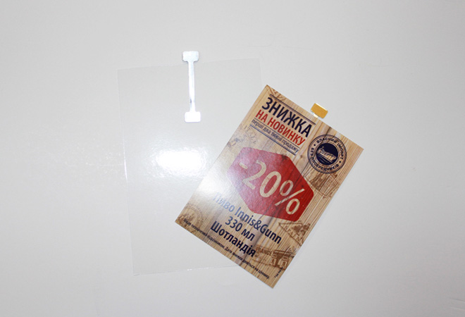 Рекламный воблер комплектуется пластиковой ножкой, благодаря которой крепится на витрины или стеллажи. Даже на влажных и жирных поверхностях изделие отлично держится. Иногда воблер вырубается и без ножки, если навешивается непосредственно на товар, что позволяет удешевить проведение рекламной кампании.