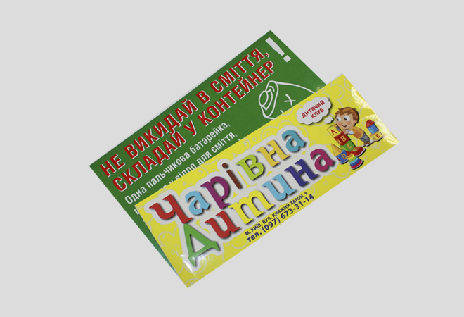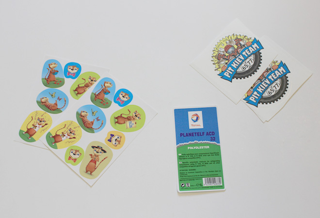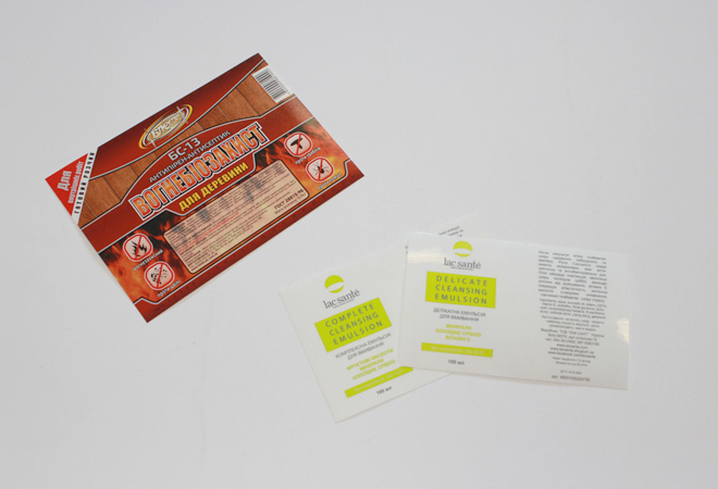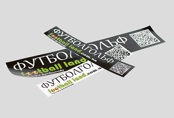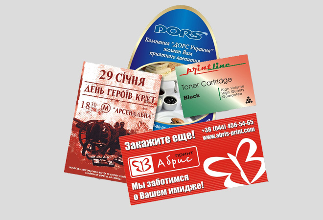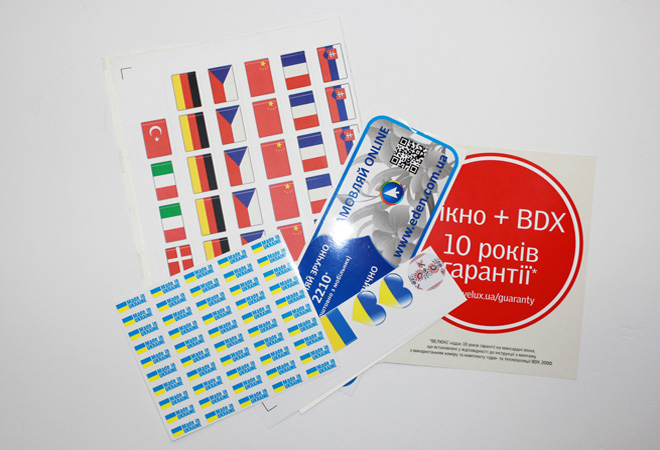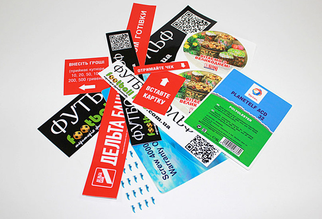 Осуществляется печать наклеек на пленке «Oracal», самоклеющейся мелованной бумаге «Xerox» или бумаге на самоклеющейся основе «Raflatac». Изображение получается стойким и максимально четким, а также устойчивым перед воздействием воды, солнечного света, жира.