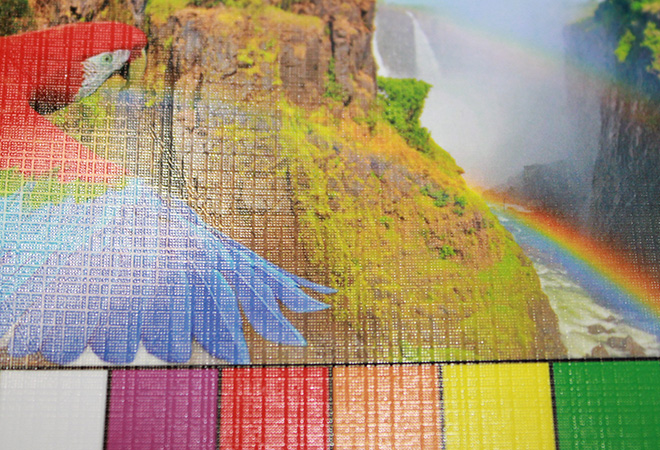 Глянцевая пленка придает материалам эффект лакированной поверхности. Цветопередача изображений при покрытии глянцевой ламинацией становиться более яркая и насыщенная. Однако мелкие элементы становятся менее читабельными из-за бликов.