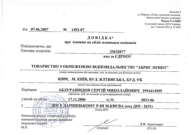USREOU (United State Register of Enterprises and Organizations of Ukraine) code 33632077